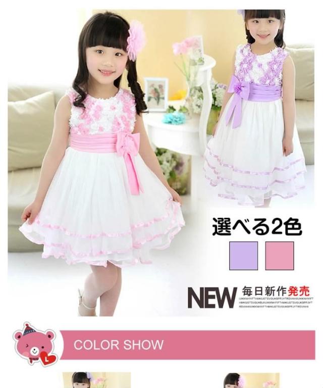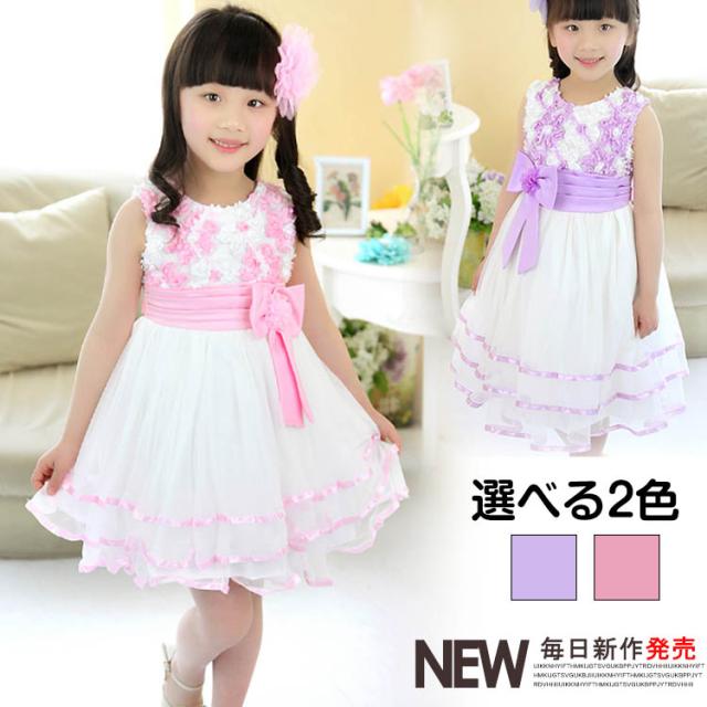 送料無料ワンピース レースワンピース ノースリーブ ベルト リボン飾り 花柄 クルーネック チュチュ 子供服 膝丈 スリム チュール お姫様
