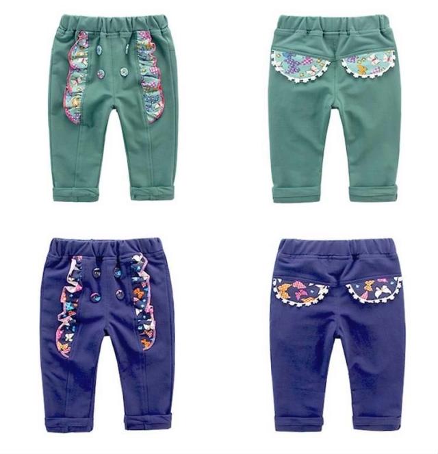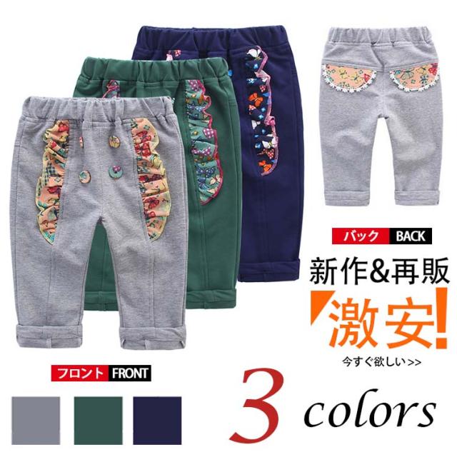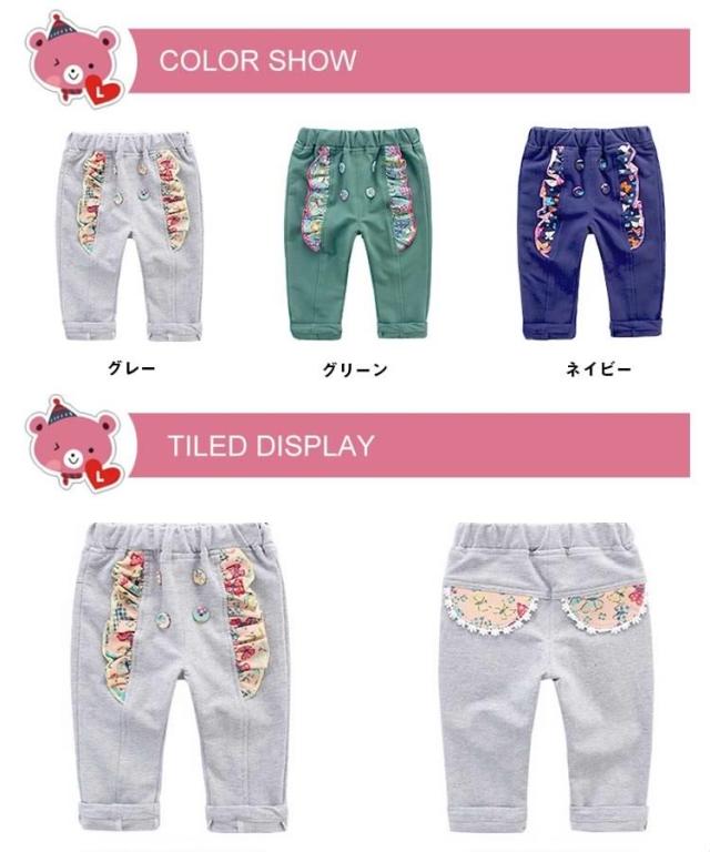 送料無料長パンツ ボトムス スカラップ柄 カートーン飾り ウェストゴム ロングパンツ ダブルボタン サルエルパンツ 子供服 キュート スウ