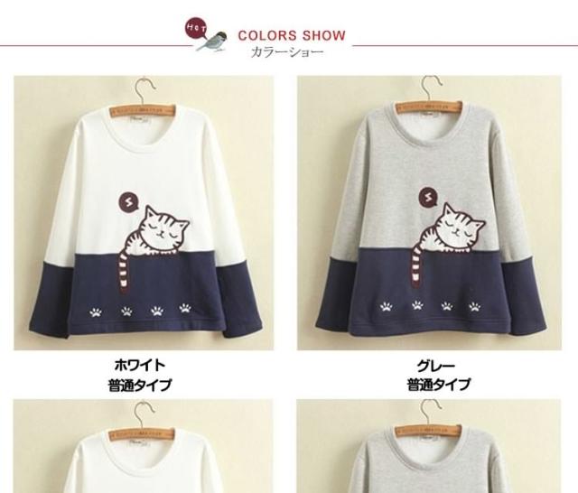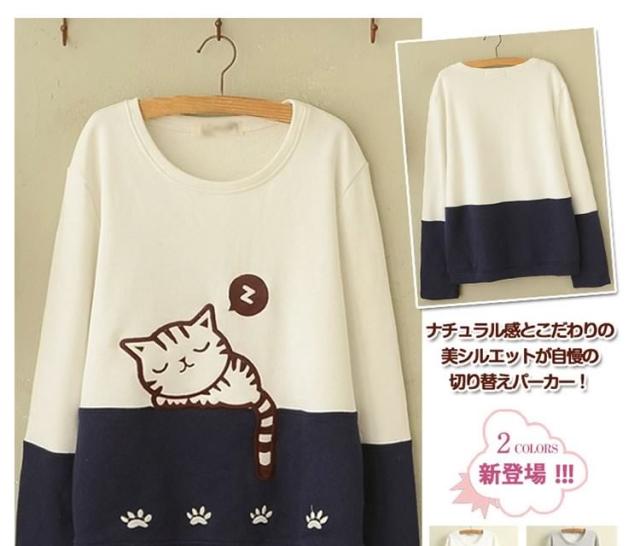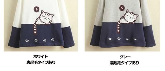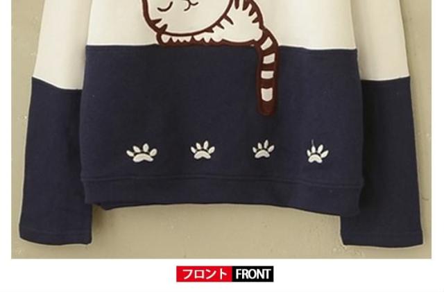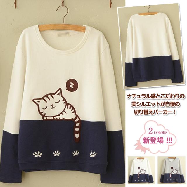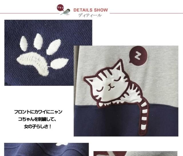 スウェットパーカー レディース 普通/裏起毛2タイプ バイカラーパーカー ニャンコちゃん刺繍パーカー 切り替えパーカー ナチュラル風パーカー