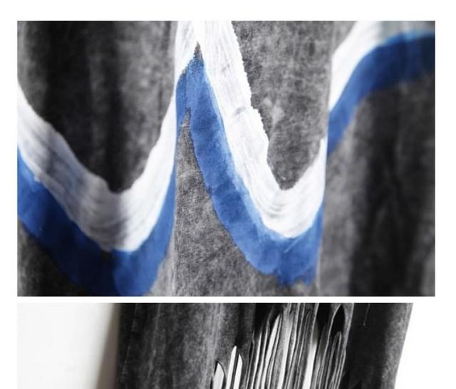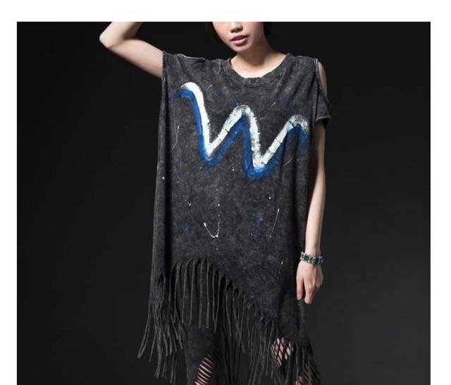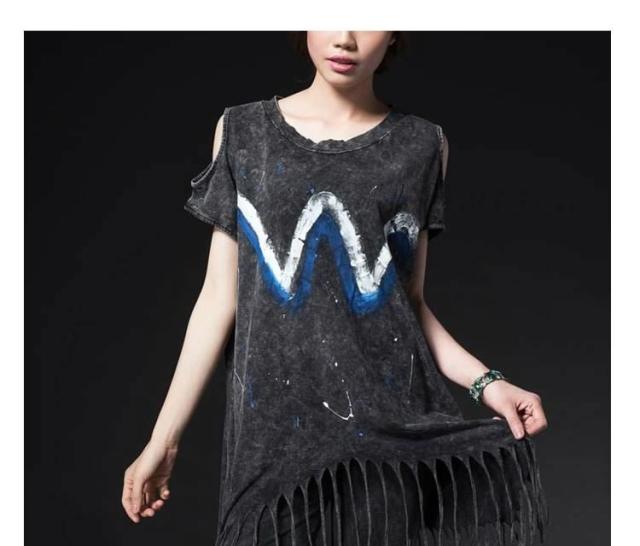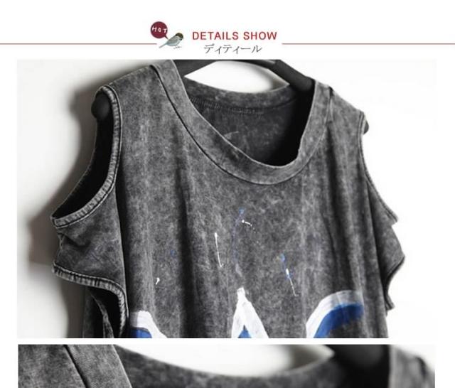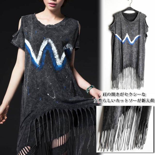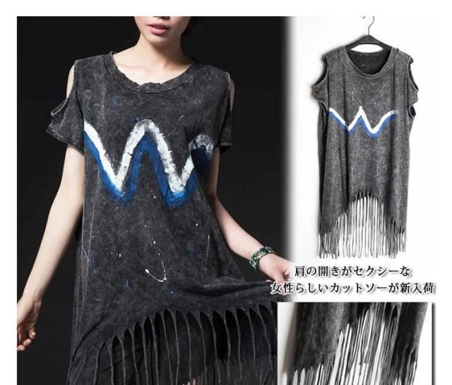 フリンジtシャツ 肩開き ラウンドネック プルオーバー 半袖tシャツ ロングtシャツ イレギュラー裾 2017新作tシャツ 落書