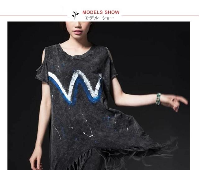 フリンジtシャツ 肩開き ラウンドネック プルオーバー 半袖tシャツ ロングtシャツ イレギュラー裾 2017新作tシャツ 落書風ゆったりシャツ