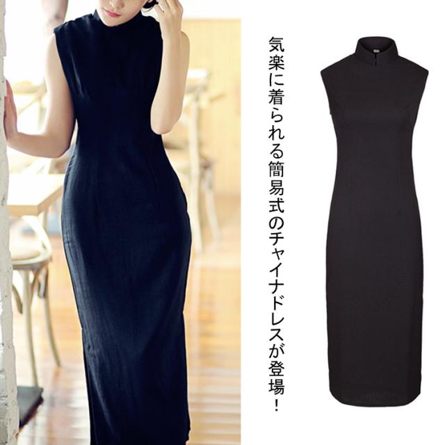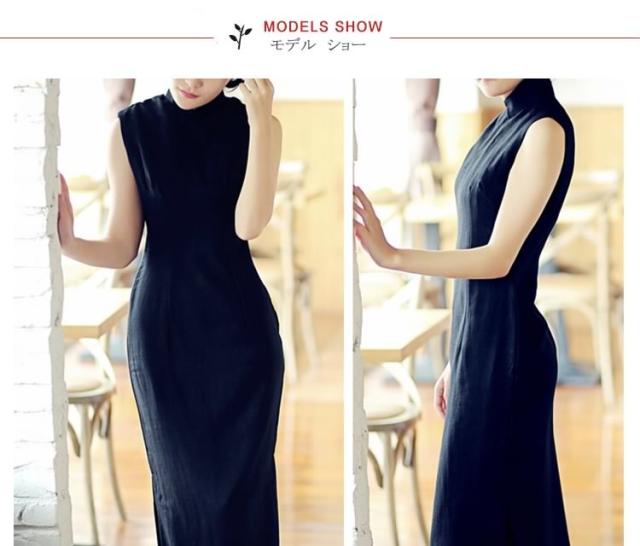 チャイナドレス ロング ブラックドレス 綿麻ドレス 袖なしドレスワンピース 中国風ワンピース タイトワンピース 立ち襟 チャイナ