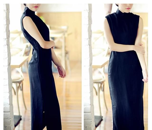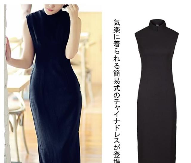 チャイナドレス ロング ブラックドレス 綿麻ドレス 袖なしドレスワンピース 中国風ワンピース タイトワンピース 立ち襟 チャイナボタン