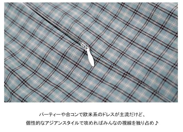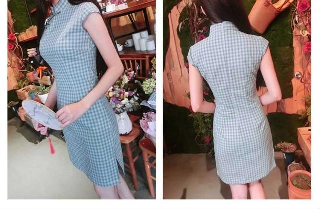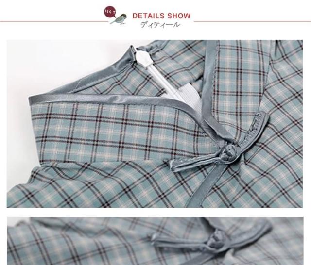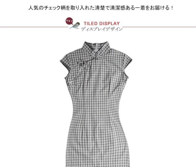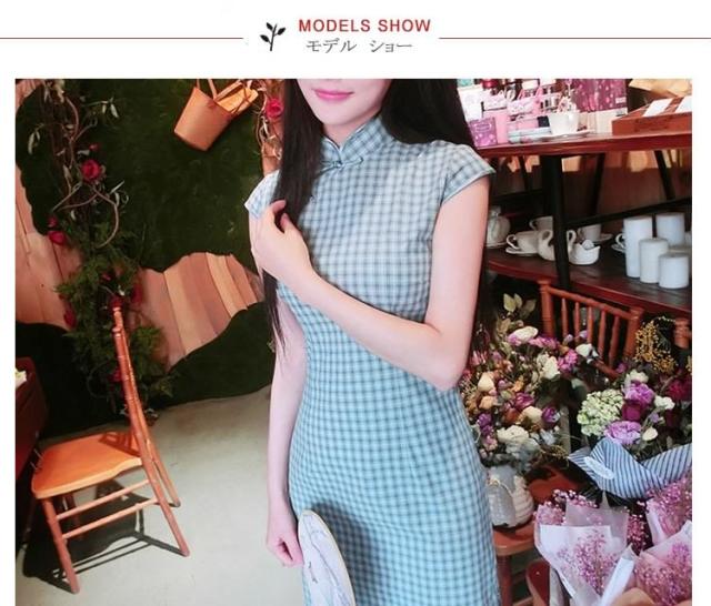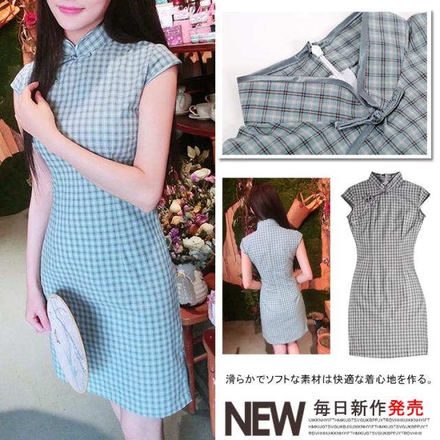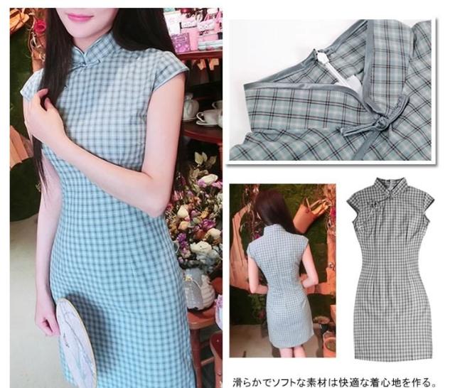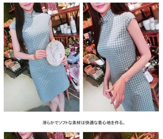 チャイナドレス ショート 綿麻ワンピース チェック柄ドレス リネンワンピース 立ち襟 斜めチャイナボタン付き ミニチャイナドレス