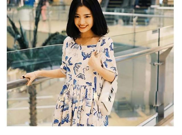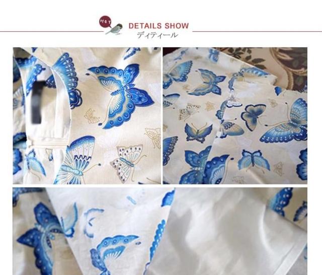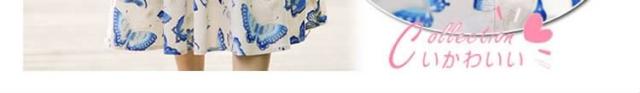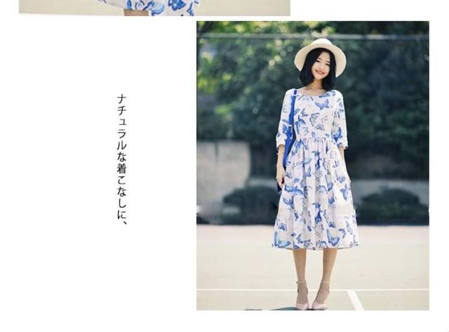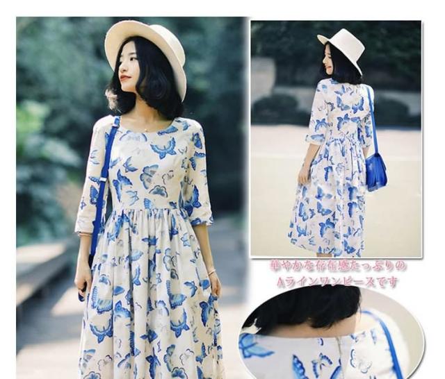 7分袖ワンピース ミディアム丈フレアワンピース レディース 膝丈 クルーネック プリーツ Aライン vネック 蝶柄 バタフライ