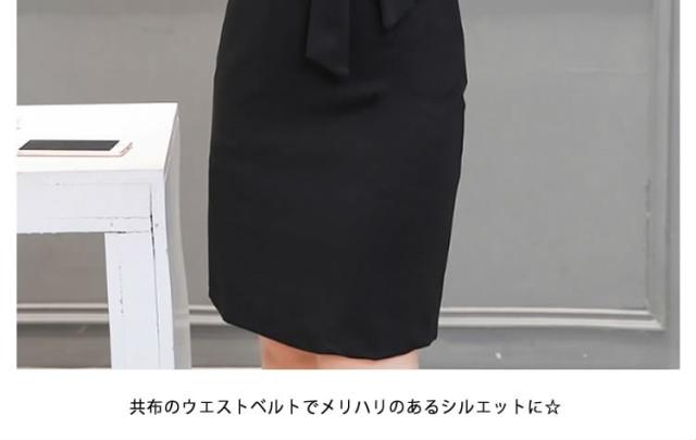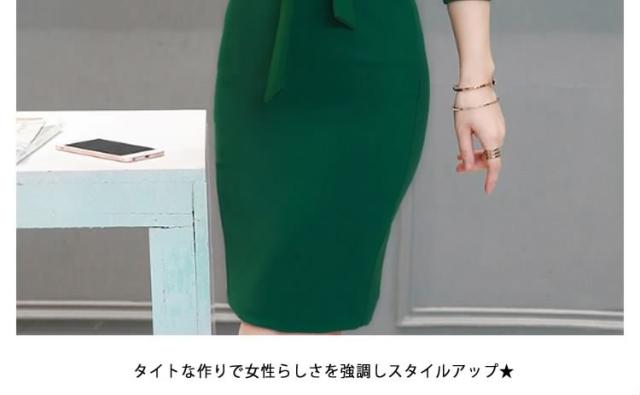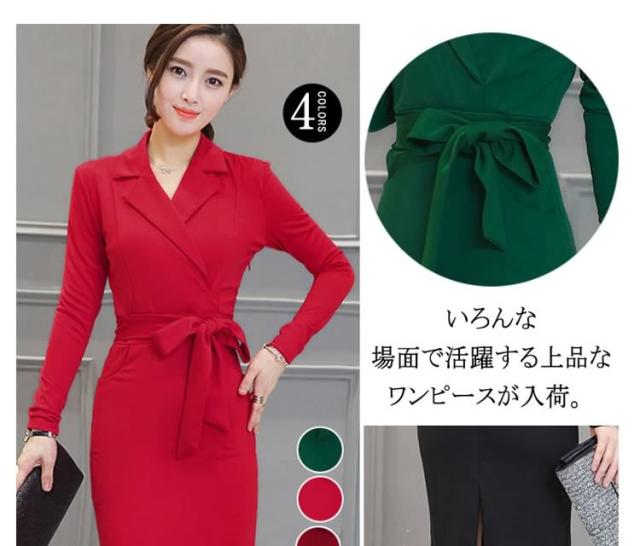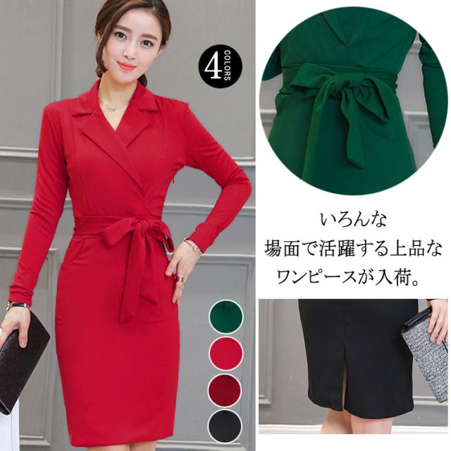 ミディアムワンピース タイトワンピース レディース 膝丈 長袖 ノッチドラペル 無地 リボン結び OL フォーマル 正装 通勤