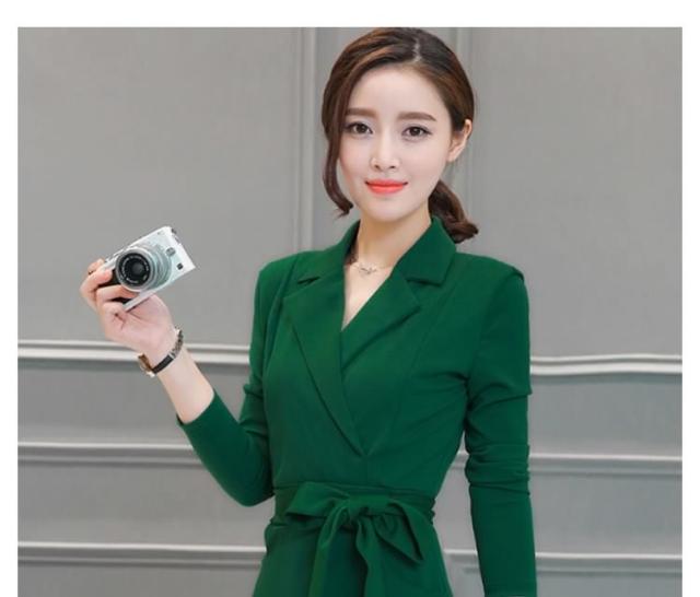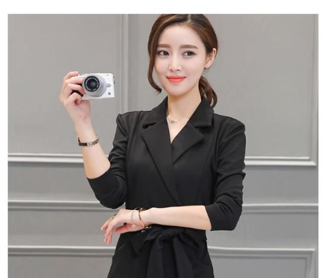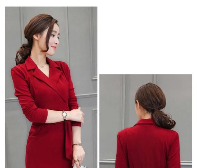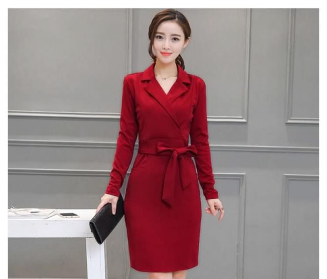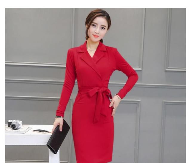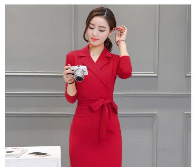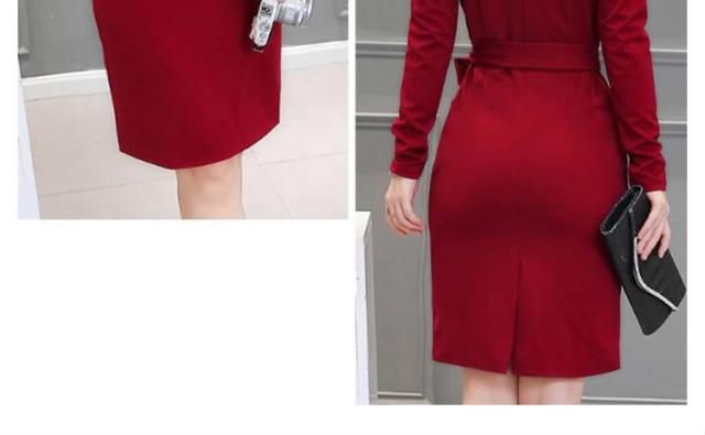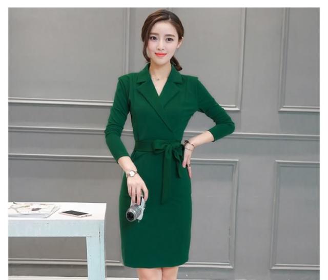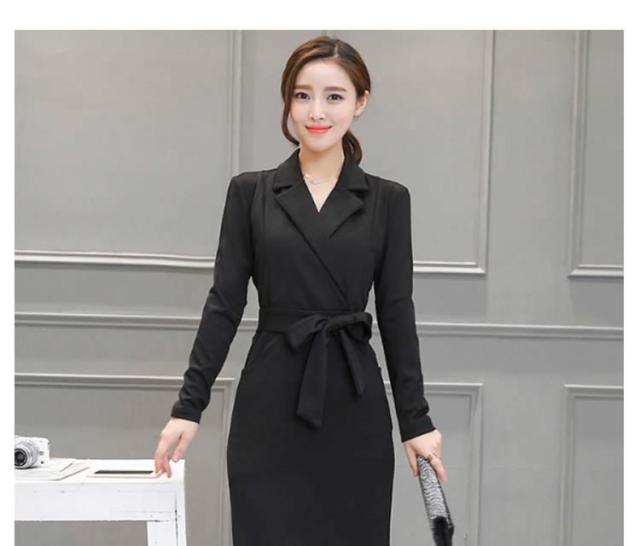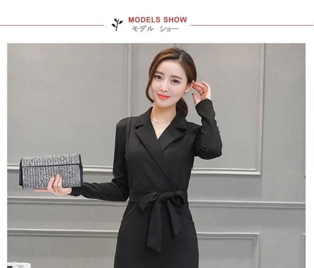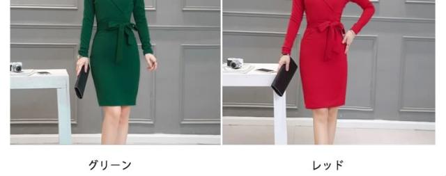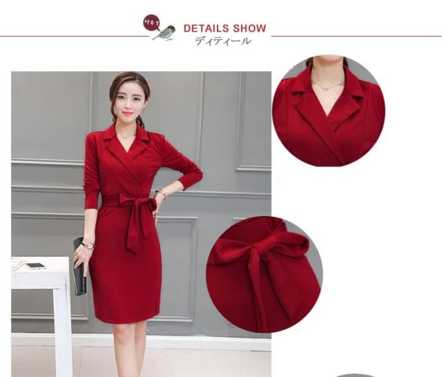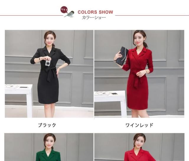 ミディアムワンピース タイトワンピース レディース 膝丈 長袖 ノッチドラペル 無地 リボン結び OL フォーマル 正装 通勤 2017春新作