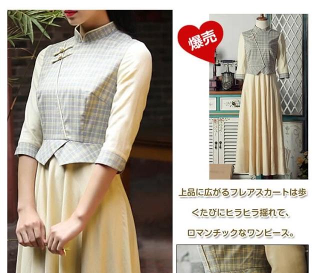 ヴィンテージ風ワンピース ロング レイヤード風ワンピース 中国風ワンピース チェック柄ワンピース バイカラーワンピース フレアワンピース