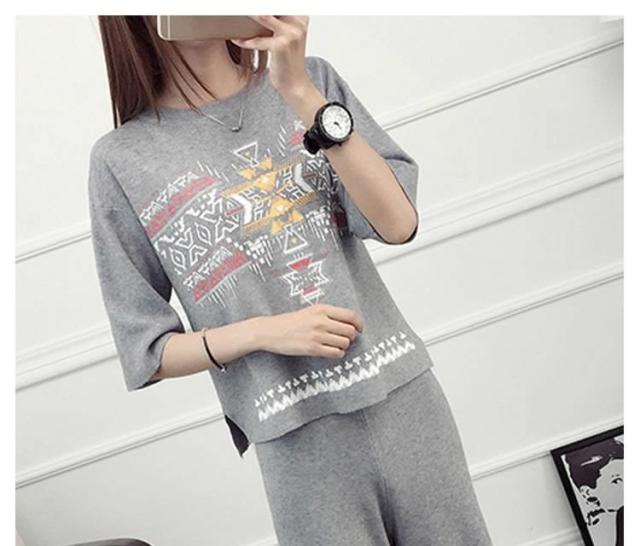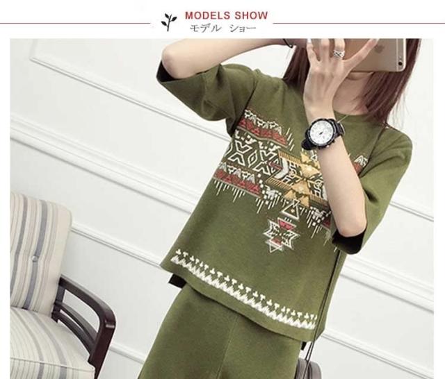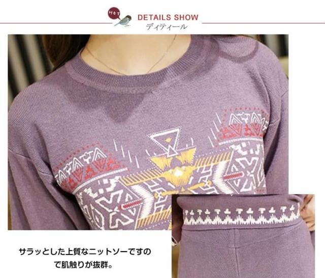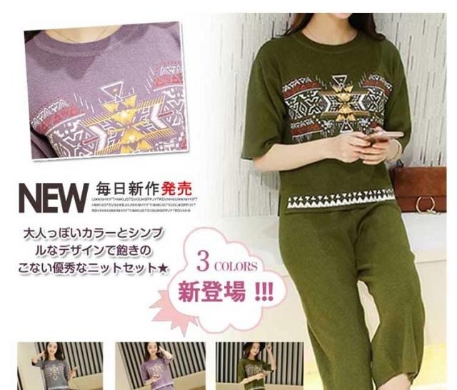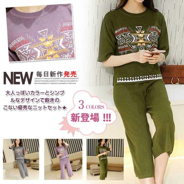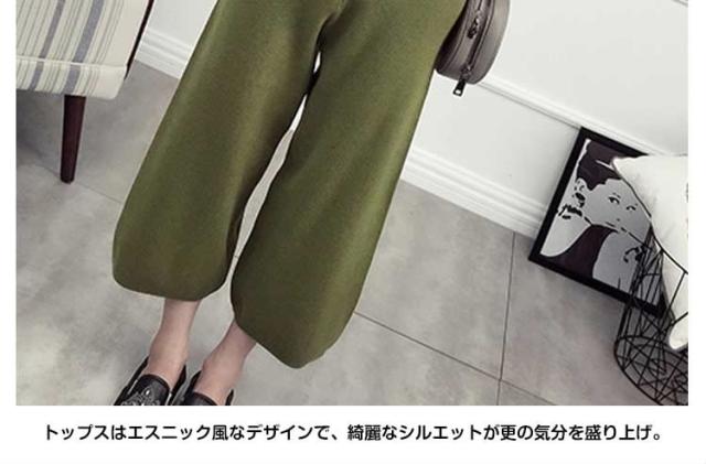 ニットセット レディース ニットセーター+ガウチョパンツ エスニックセーター クルーネック サイド浅スリット ニットガウチョパンツ