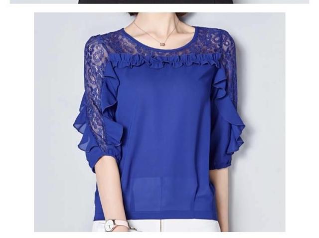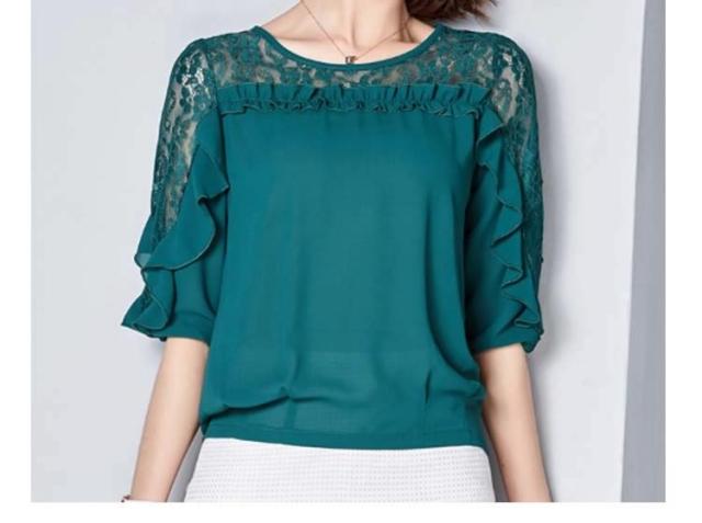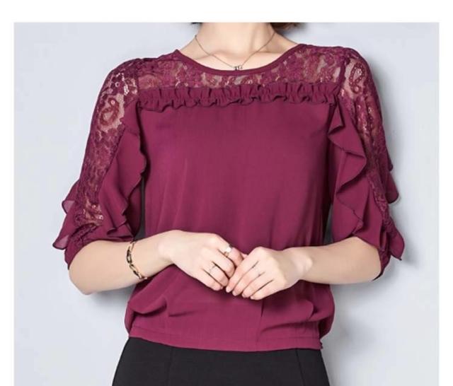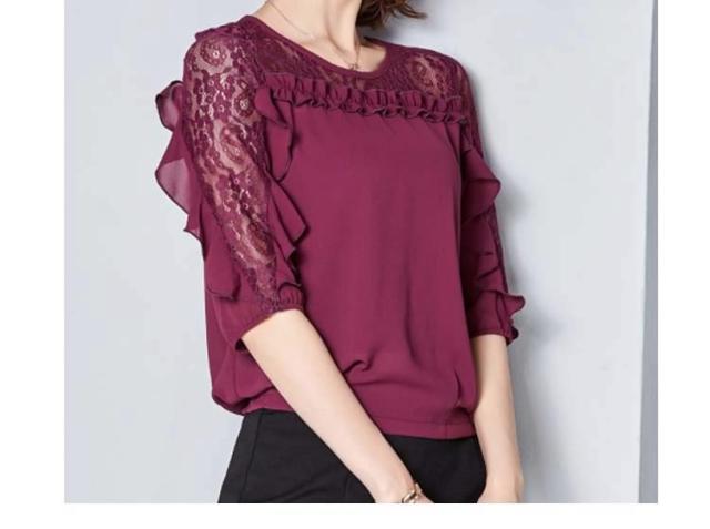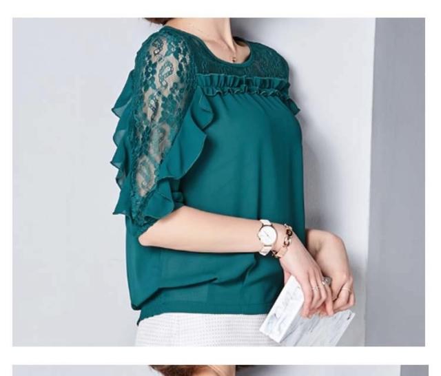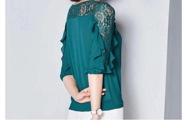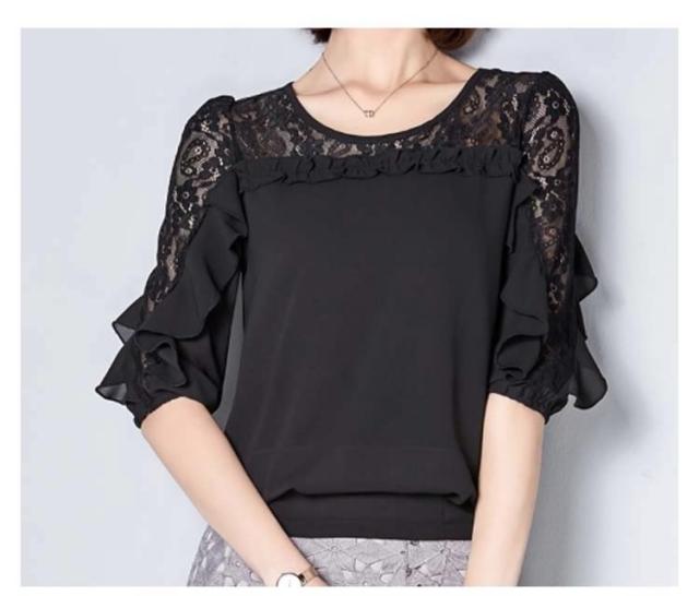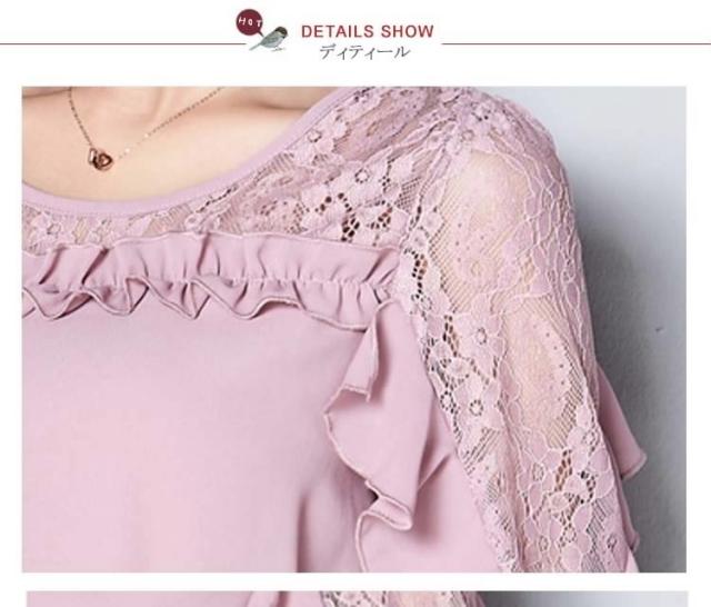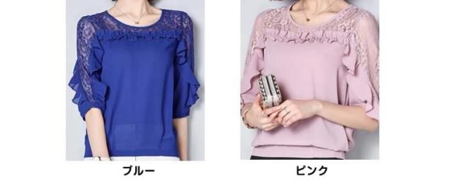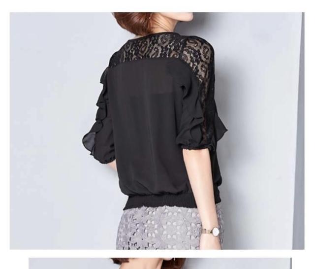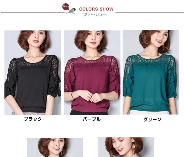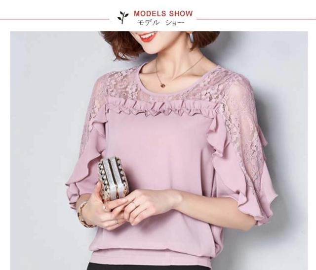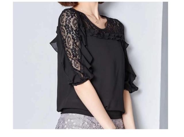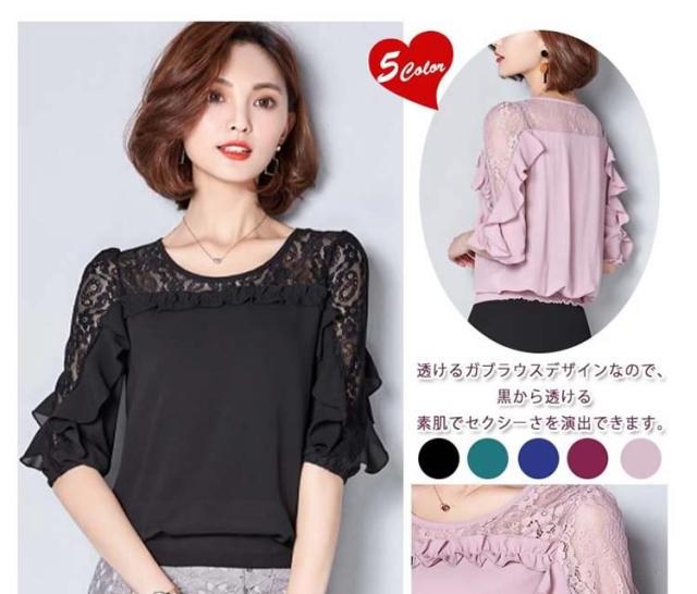 ブラウス レース 切り替え フリル レディース トップス シャツ ブラウス 五分袖 クールネック 穴 無地 上品 かわいい デ