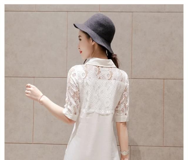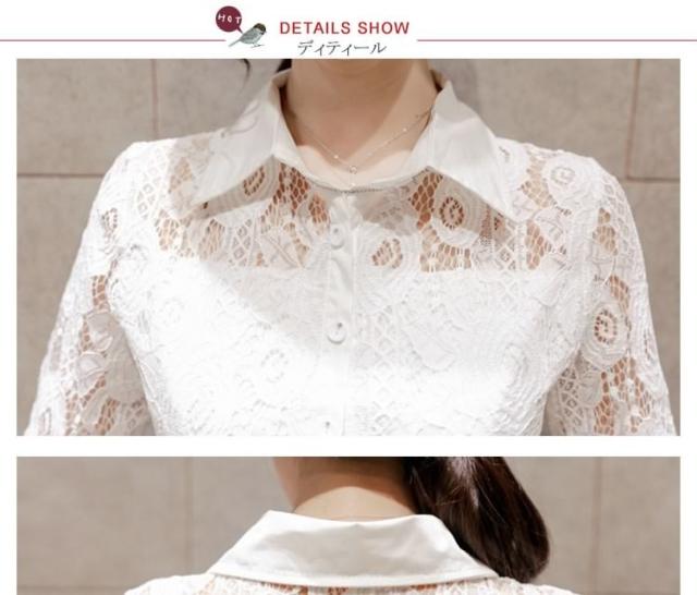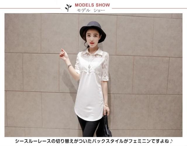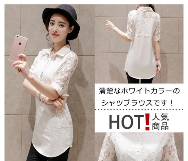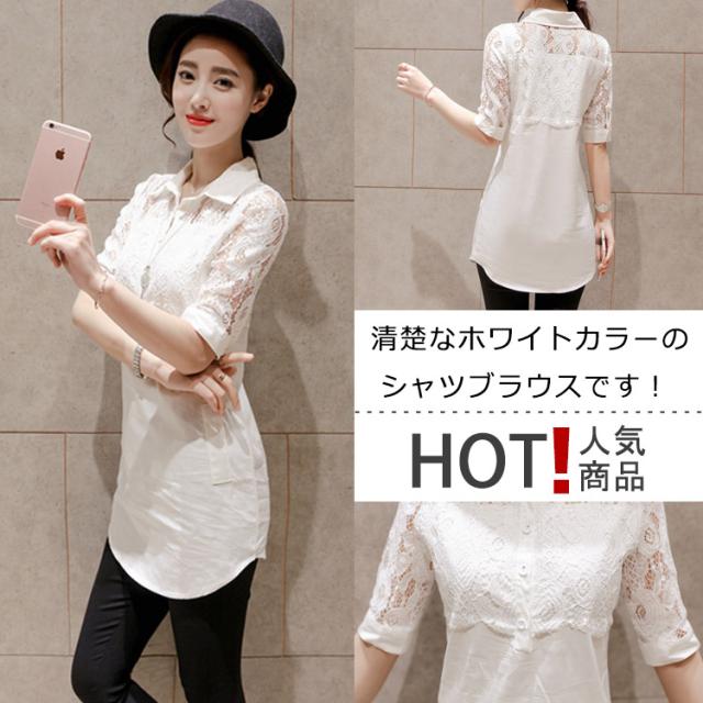 ホワイトシャツ レース切り替え レディース ロングシャツ チュニックシャツ シャツブラウス Aライン 長袖 花柄レース 爽やか