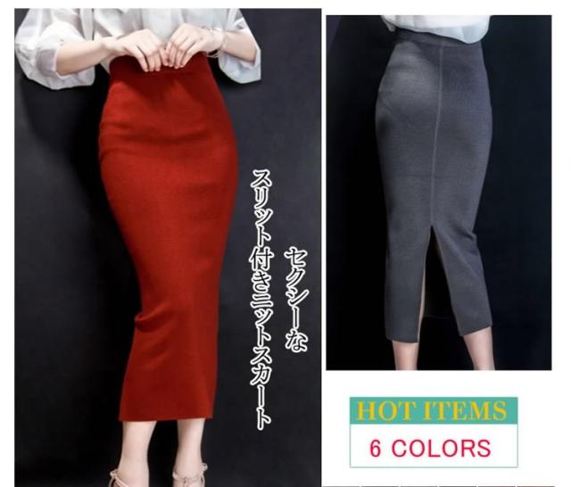 レディーススカート/マキシスカート/ロングスカート/ニットスカート/ロンスカ/タイトスカート/ボトムス/ハイウェスト/スリット/