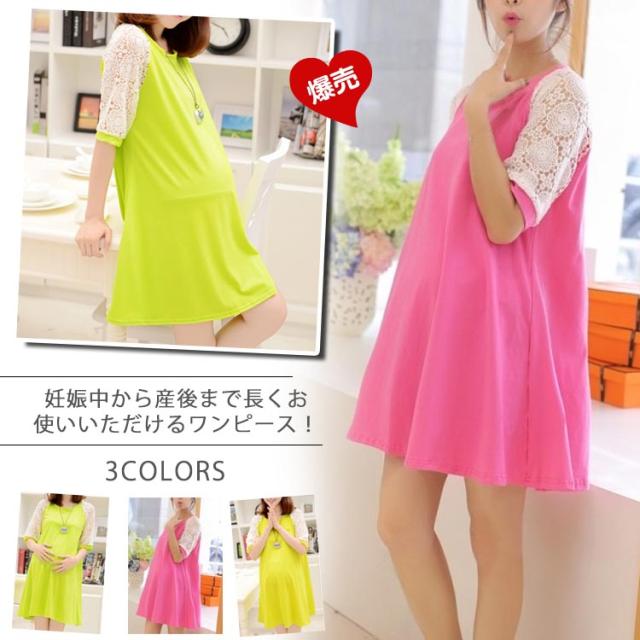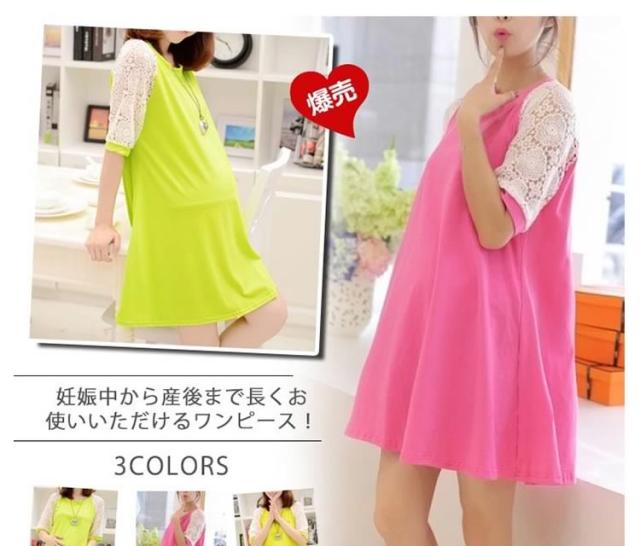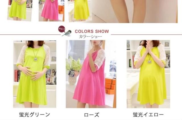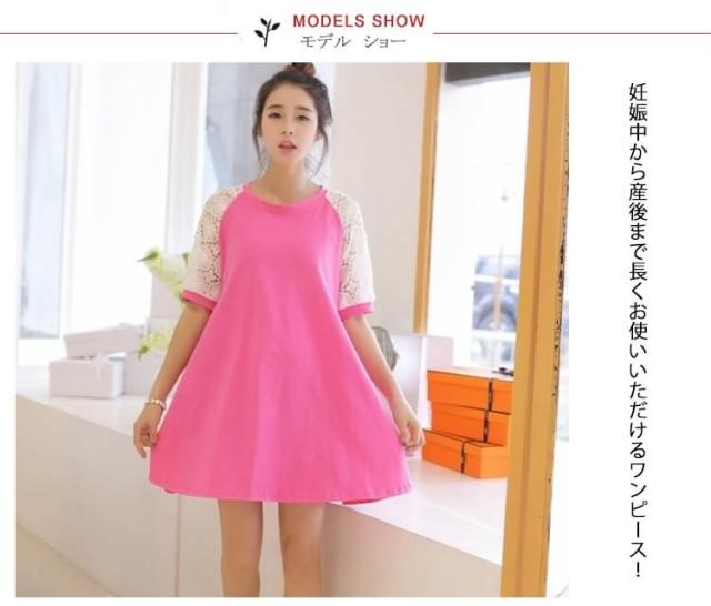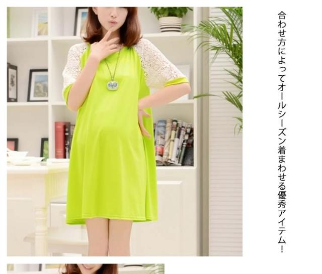 マタニティドレス フレアワンピース スウェットワンピース ショート レース切り替えワンピース 七分袖 妊娠服 婦人服 夏服 普段