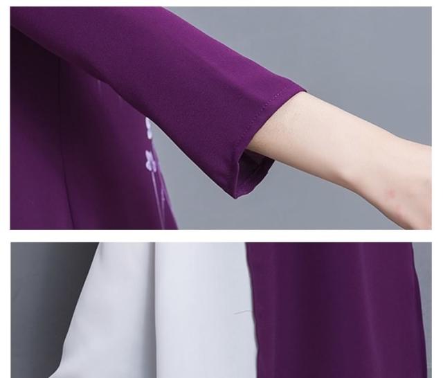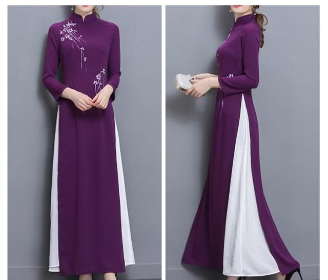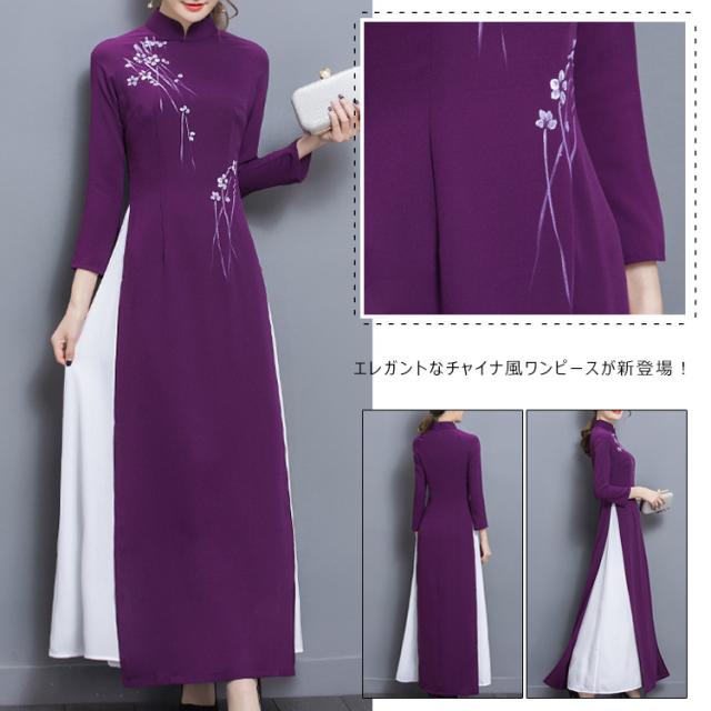 チャイナドレス チャイナワンピース 旗袍 レディース 長袖 ロング丈 梅プリント フェイクレイヤード 重ね着風 フレア 着やせ