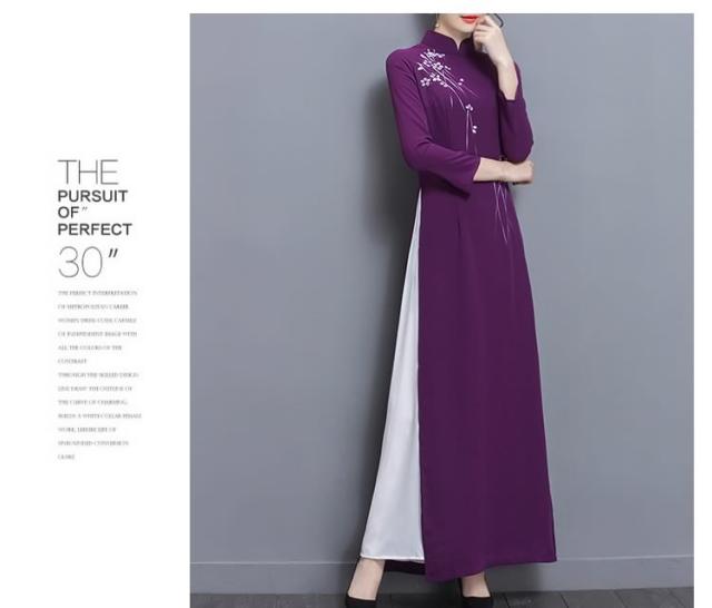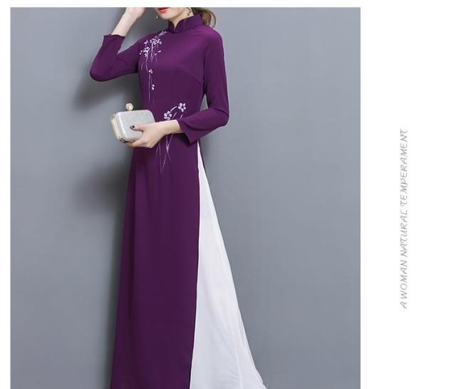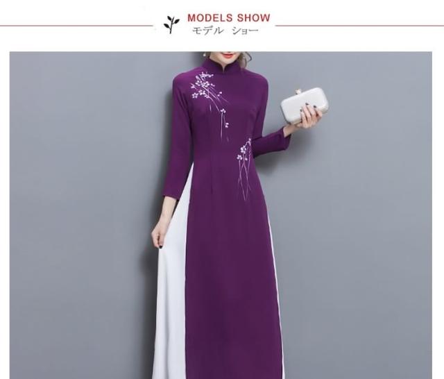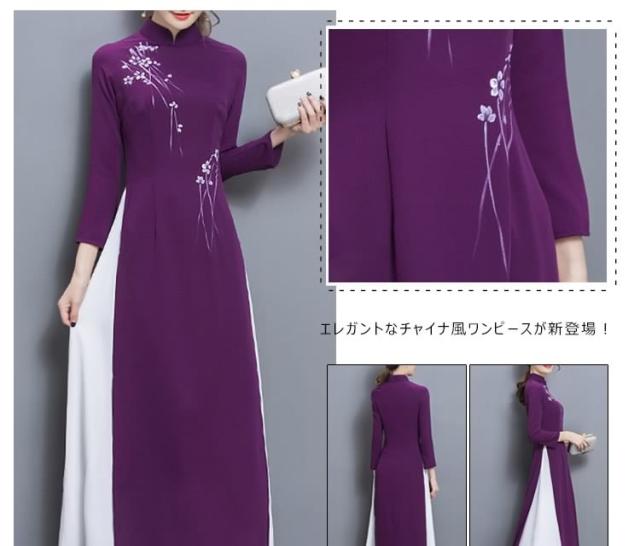 チャイナドレス チャイナワンピース 旗袍 レディース 長袖 ロング丈 梅プリント フェイクレイヤード 重ね着風 フレア 着やせ 2017春新作
