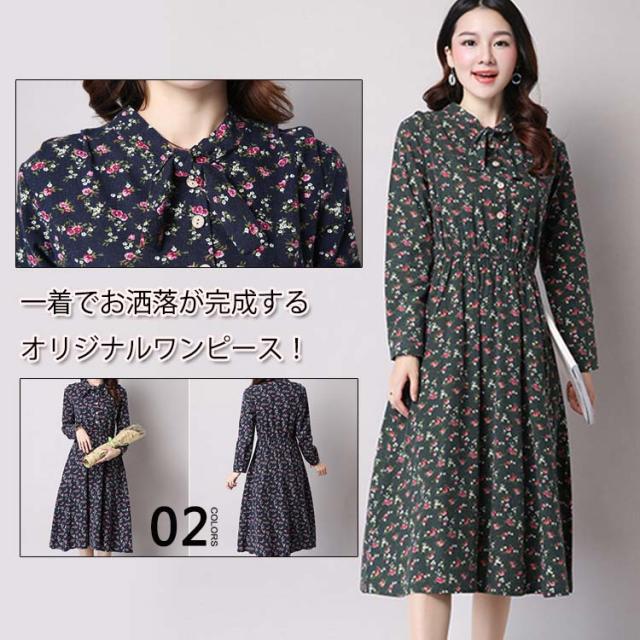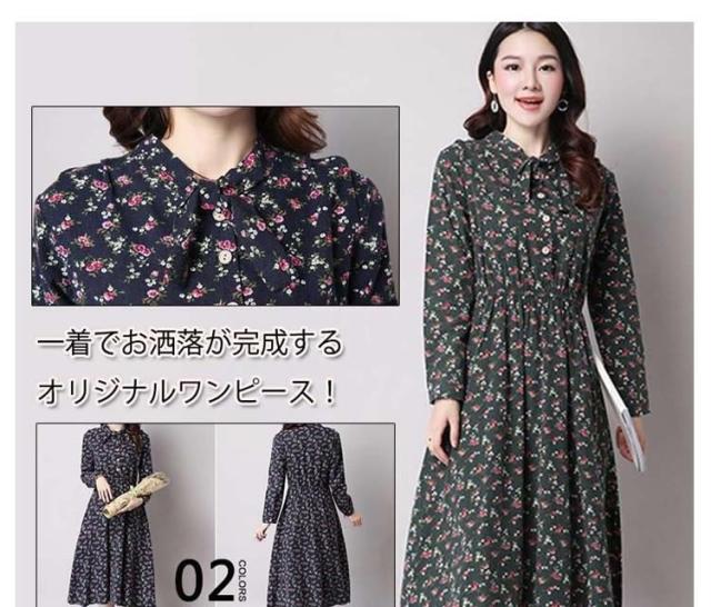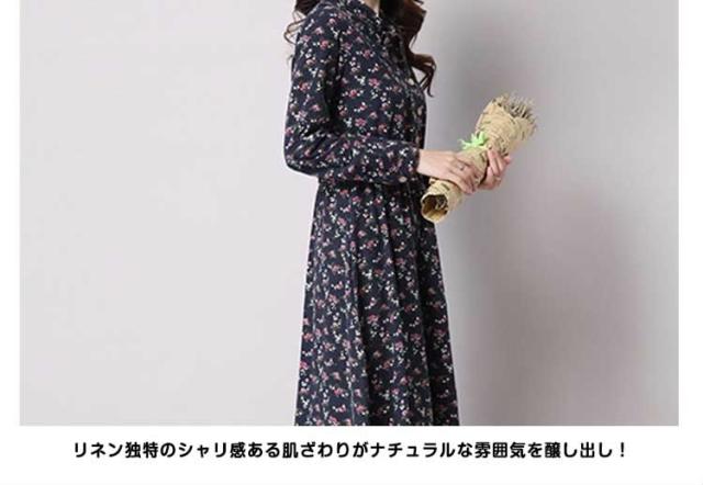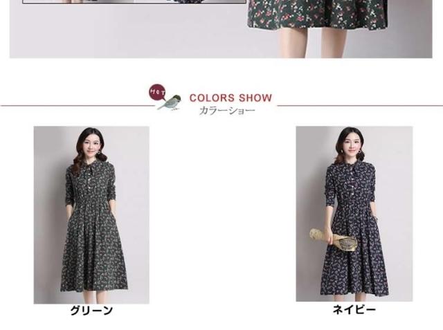 綿麻ワンピース プリントワンピース ロング フレアワンピース シャツワンピース ナチュラル風ワンピース 森ガール系 Aラインワン