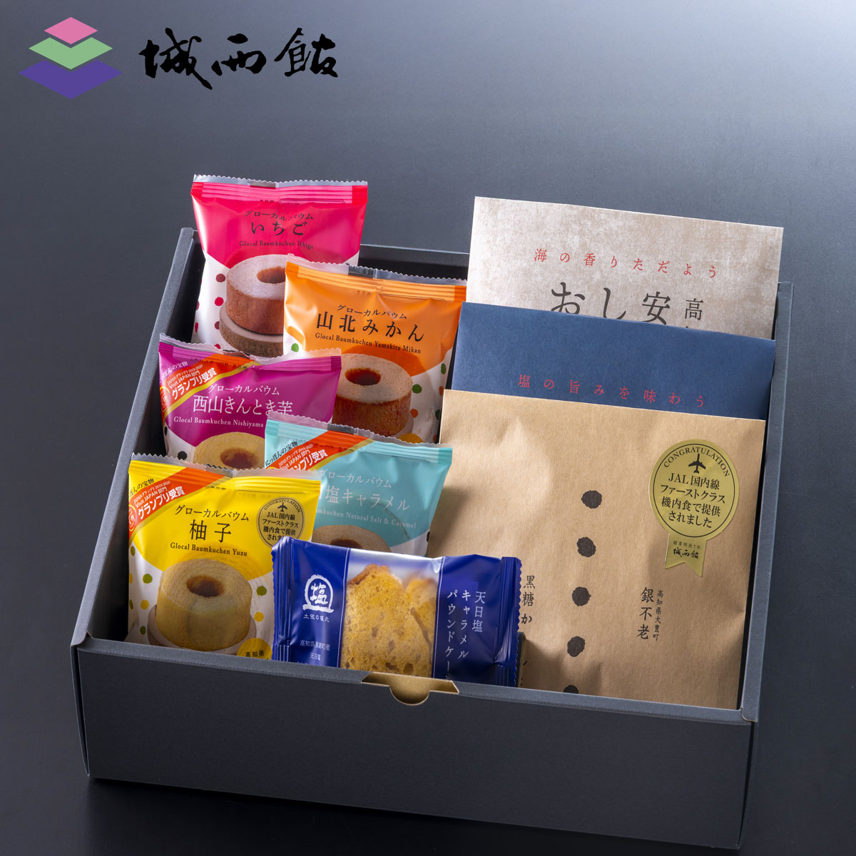 | 内容量 | 銀不老かりんとう 54g×1、天日塩おかき 54g×1、安芸市産おかき 54g×1、天日塩キャラメルパウンドケーキ×1 グローカルバウム5個(柚子、天日塩キャラメル、西山きんとき芋、山北みかん、いちご/各1個) |