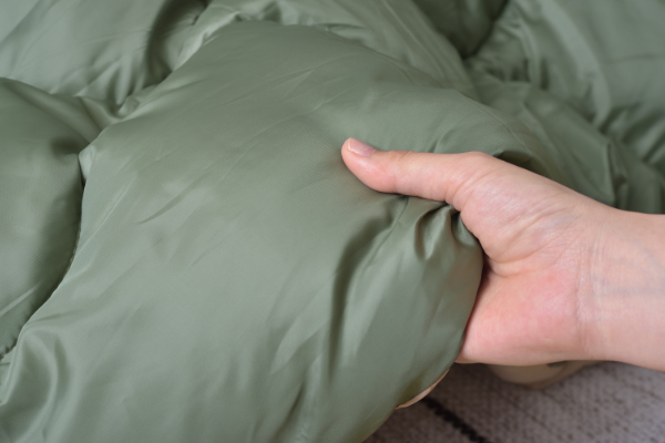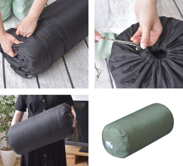 寝袋のような収納バックが付いています。布団をくるくると巻いて収納して持ち運べるので、キャンプなどのアウトドアにも最適です。