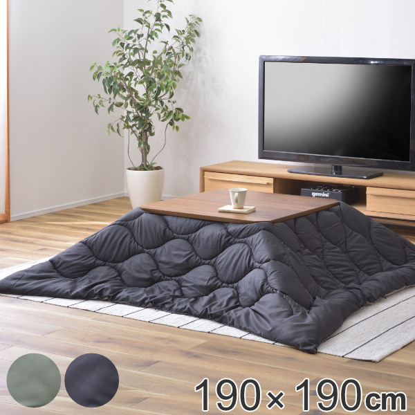 190cm×230cmの長方形タイプのコタツ布団です。撥水加工が施されていて、飲み物などをこぼした時汚れをはじくので、お手入れも簡単です。