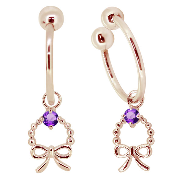 イヤリング レディース 揺れる リボン アメジスト フープ ノンホールピアス 2月誕生石 10k りぼん