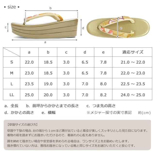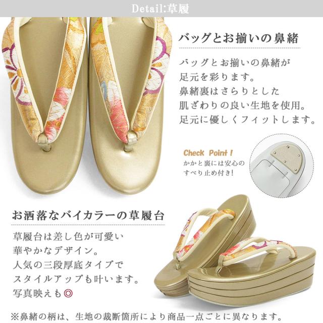 人気の厚底草履は異なるカラーを使用した豪華な3枚芯になっており、お着物姿をより一層美しく演出します。