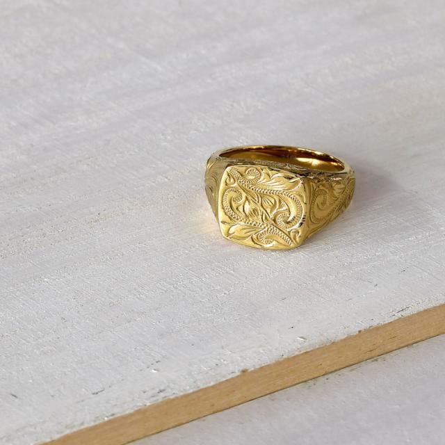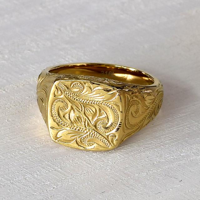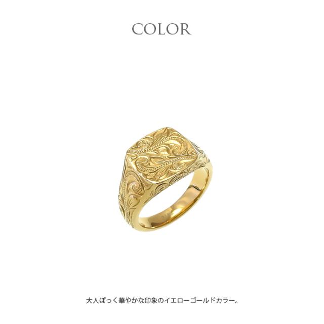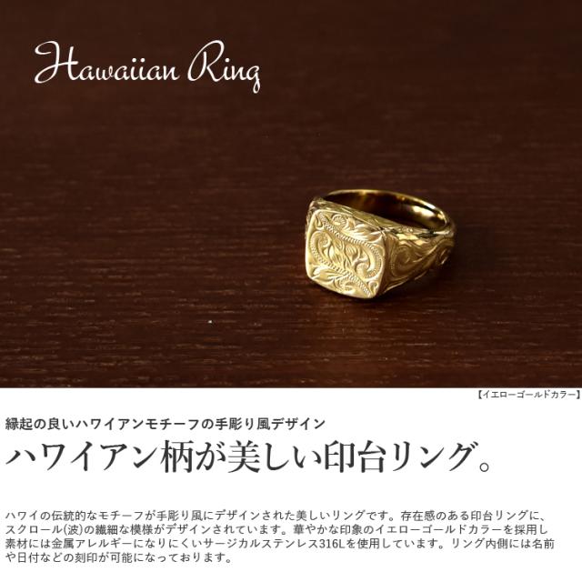 ハワイの伝統的なモチーフが手彫り風にデザインされた美しいリングです。存在感のある印台リングに、スクロール(波)の繊細な模様がデザインされています。 華やかな印象のイエローゴールドカラーを採用し、素材には金属アレルギーになりにくいサージカルステンレス316Lを使用しています。 リング内側には名前や日付、メッセージなど無料で刻印をお入れすることができるので、誕生日、記念日、クリスマス、バレンタインデー、ホワイトデー、母の日、父の日など特別なギフトにおすすめです。