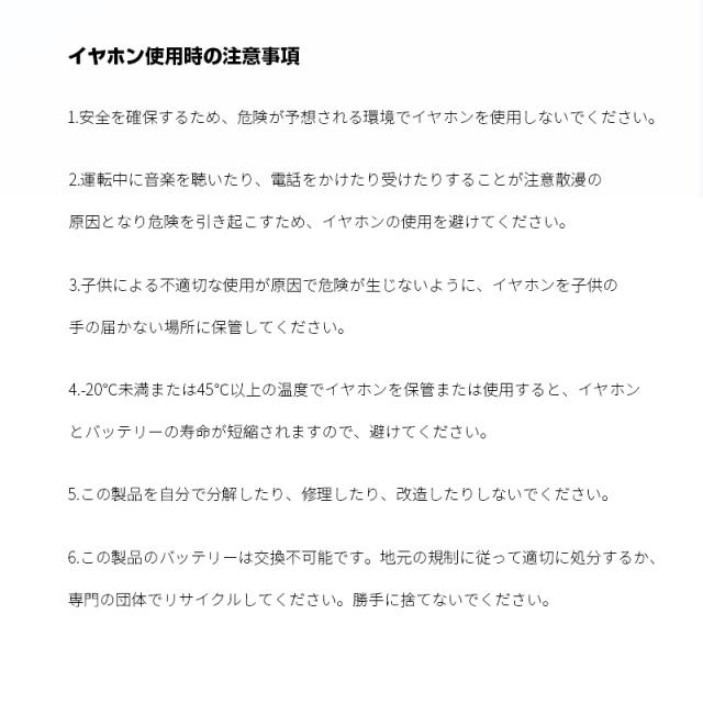 イヤホン本体、充電ケース、Type-C充電ケーブル、イヤーピース「小、中、大各2個全6個」取扱説明書。