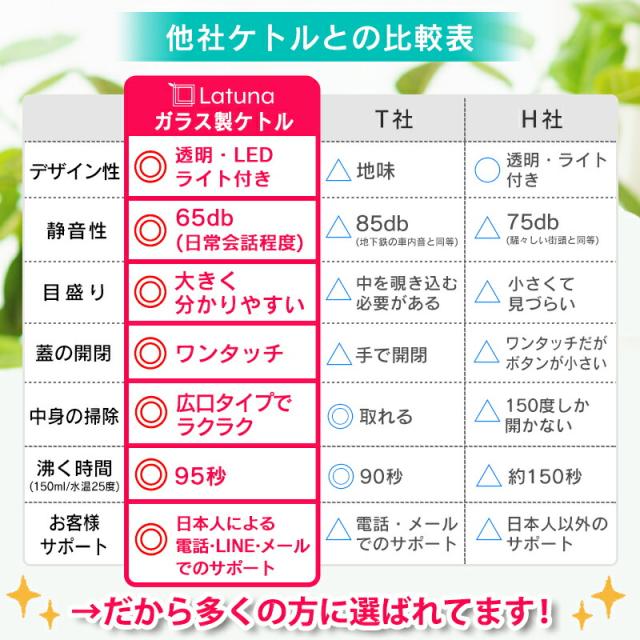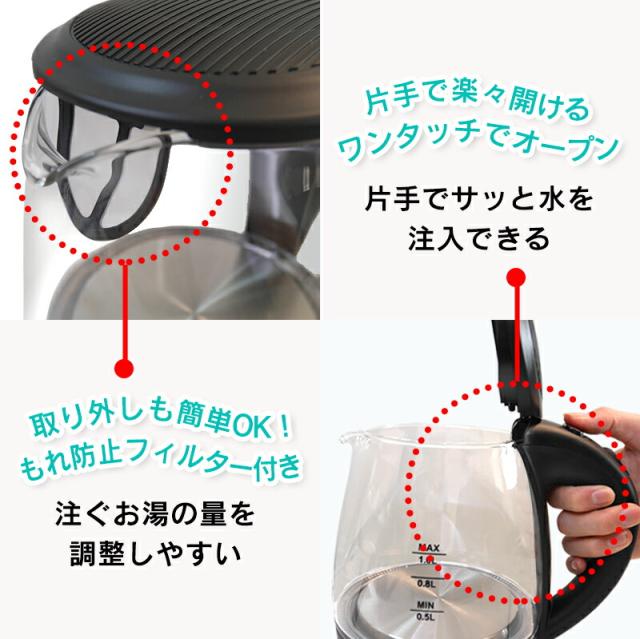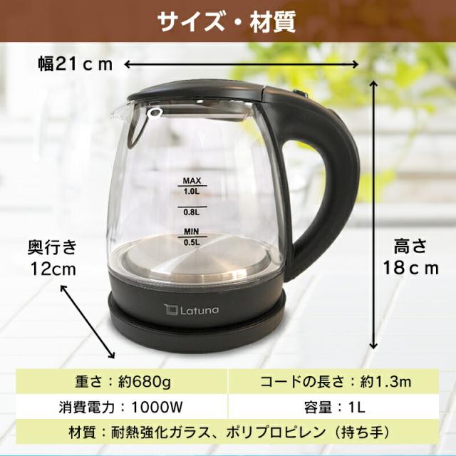 - 注文の翌日には届き早さにびっくり!ありがとうございます。 今までずっとティファールを使用していましたが沸く時間は変わらないし、ガラスで清潔感がありLEDがとてもスタイリッシュで気に入りました。蓋がボタ...