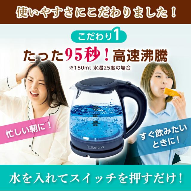 【高機能ガラス製ケトル】お湯が沸くまでわずか95秒(※150ml・水温25度の場合)!