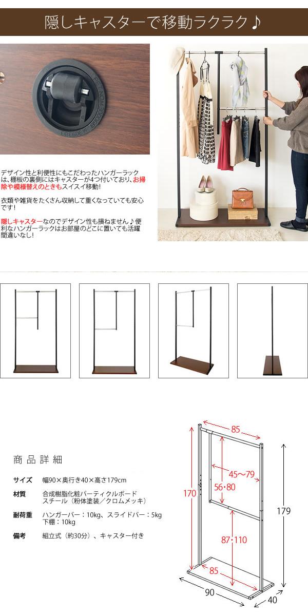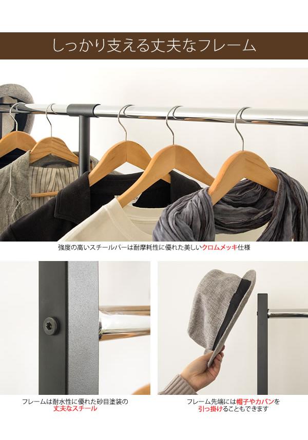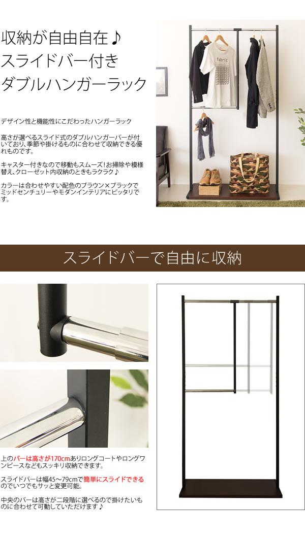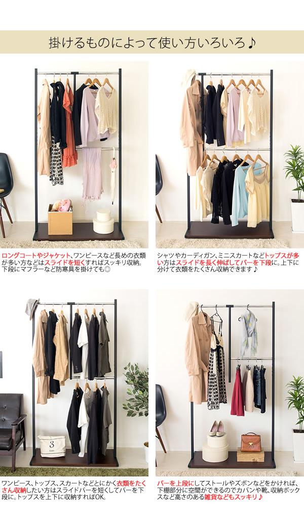 高さが選べるスライド式のダブルハンガーバーが付いており、季節や掛けるものに合わせて収納できる優れものです。br> キャスター付きなので移動もスムーズ!お掃除や模様替え、クローゼット内収納のときもラクラク♪