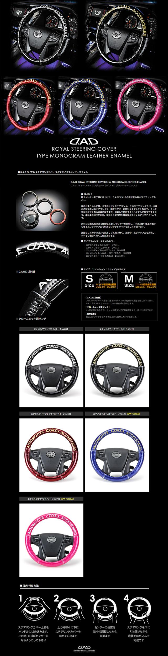 | 特徴 | 【簡単装着】 純正ステアリングを外さずに純正ステアリングの上から被せるだけの簡単装着。 【型押しD.A.Dモノグラム&D.A.Dロゴ】 握手部に彫り深く型押しされたD.A.DモノグラムとD.A.Dロゴ刺繍がD.A.Dブランドの圧倒的な存在感を演出させています。 【クロームメッキ調リング】 アクセントとして、4ヵ所にクロームメッキ調リングを施し、際立った存在感を醸し出します。 |