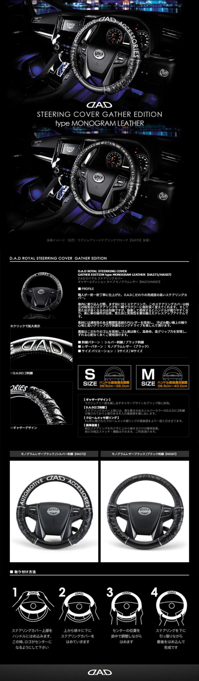 【出荷実績50万本】D.A.D ロイヤルステアリングカバー ギャザー モノグラムレザー HA507 サイズS/M ブラック刺繍 ハンドルカバー DAD ギャルソン GARSON