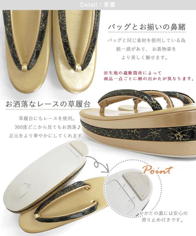 バッグのマチや草履台にもレースを使用しているため、お着物姿をより華やかに引き立てます。