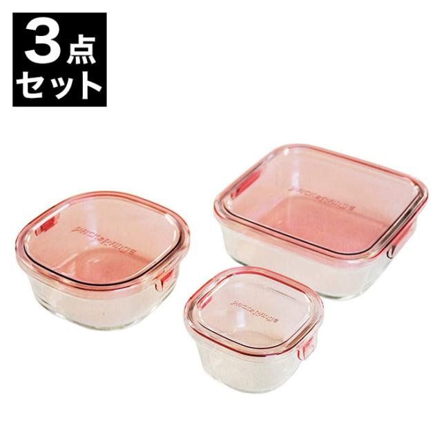 イワキ iwaki 耐熱ガラス 保存容器 グラスコンテナ 角型3点セット ピンク PS-PRN-3P1 電子レンジ対応 食洗機対応 シンプル