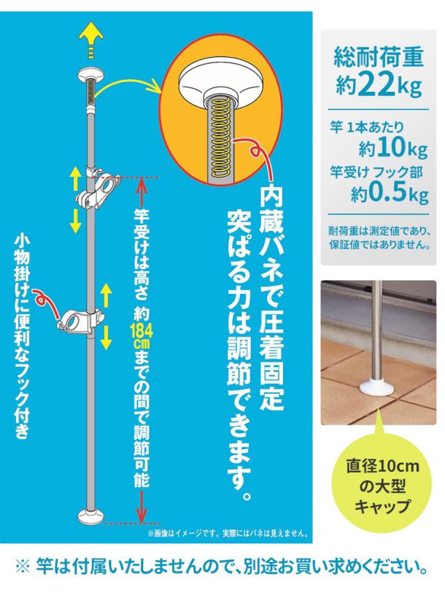 使用できる竿の直径は一般用〜4cmまで、竿受けの高さも調節可能&小物掛けに便利なフック付き。