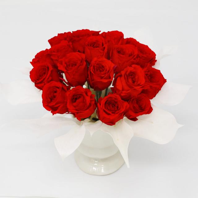 ◆真っ赤なローズをたくさん使いブーケに見立てて、贈り物としてぴったりの豪華なアレンジメント。