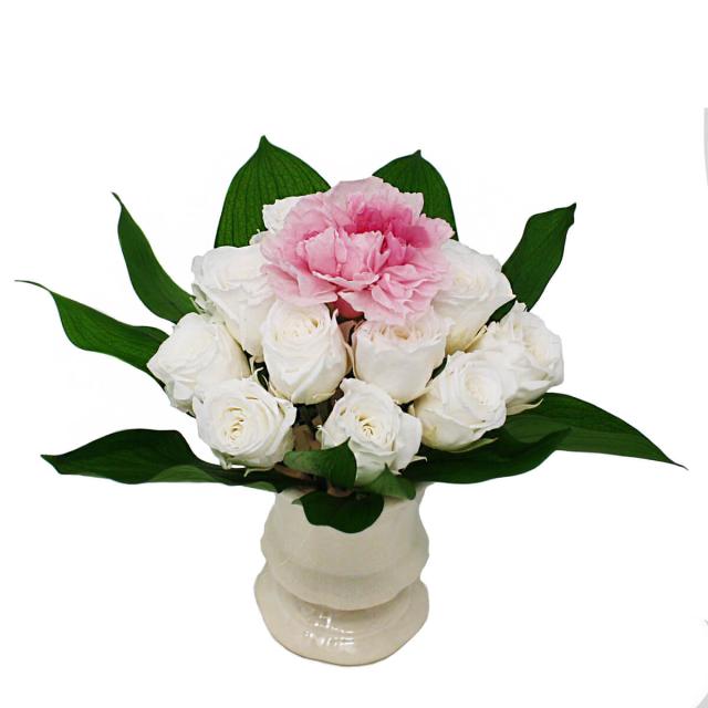◆カーネーションを中心にまわりを白いローズで包み可憐で美しいアレンジメント。