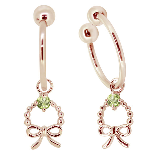イヤリング レディース 揺れる リボン ペリドット フープ ノンホールピアス 8月誕生石 10k りぼん