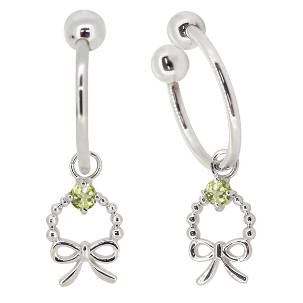 ノンホールピアス フープ 揺れる りぼん イヤリング ペリドット 8月誕生石 プラチナ レディース イヤーカフ