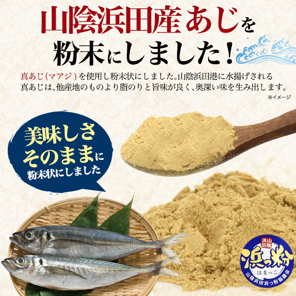 「真あじ」を使用し粉末状にしました。山陰浜田港に水揚げされる真あじは、