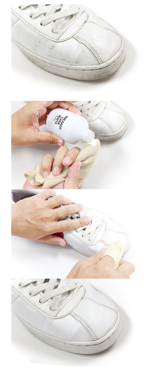 ●白革(ツヤ革の天然皮革、合成皮革)を使用したスニーカー用のローションタイプの汚れ落としです。