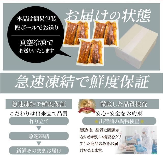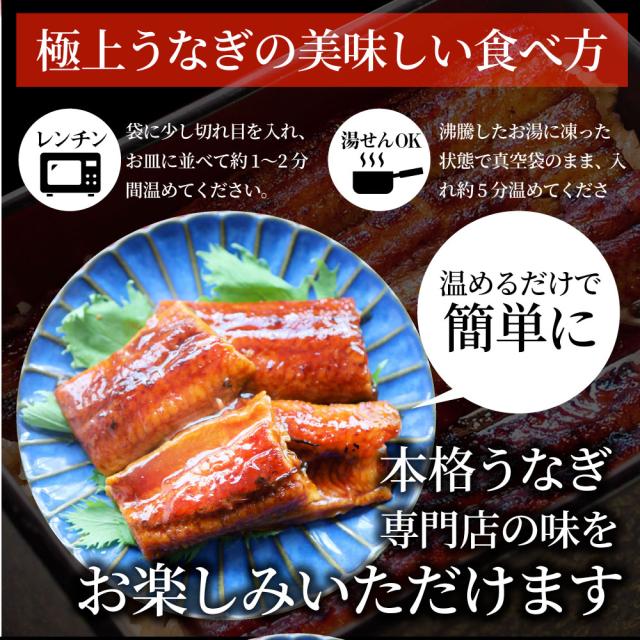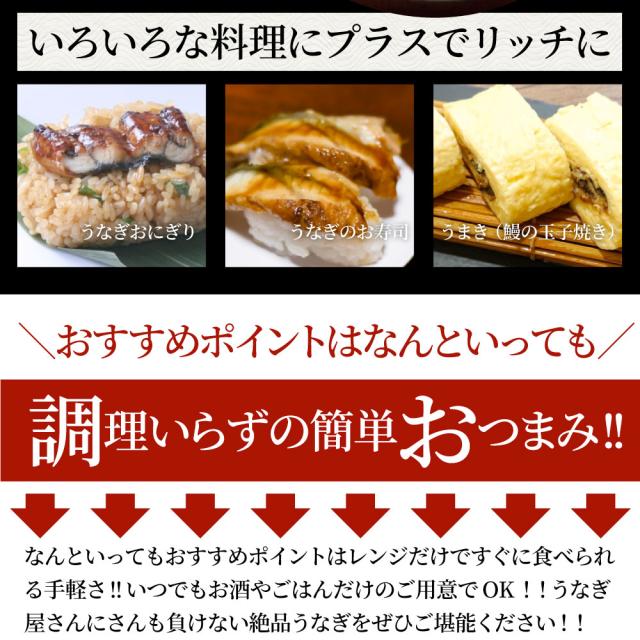 | お召し上がり方 | 本製品は加熱してありません。お召し上がりの際は必ず加熱してお召し上がりください。 <ボイルで>パックのまま沸騰したお湯で4〜5分加熱してください。 <電子レンジで>真空パックから蒲焼を取り出して皿にのせ、ラップをかけて加熱してください。500W:1分40秒〜2分 600W:1分20秒〜1分40秒 |