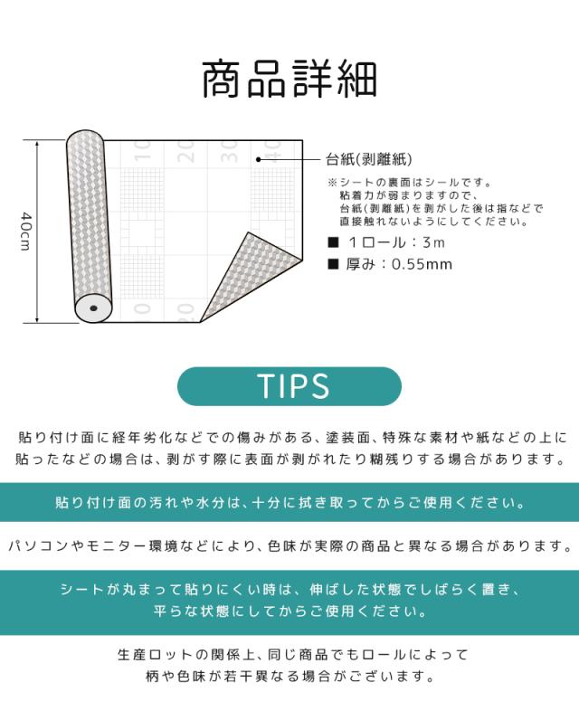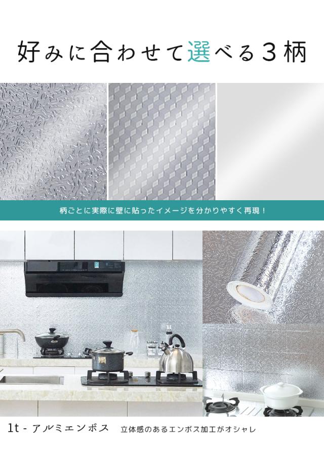 | 商品詳細 | ■1ロール:40cm×3m ■厚み:約0.55mm ■カラー/好みに合わせて選べる3柄 ・1tアルミエンボス【立体感のあるエンボス加工がオシャレ】 ・2tアルミブロック【幾何学的な模様を施してスタイリッシュな印象】 ・3tクリア【壁などの色や柄を活かしながら使える透明シート】 〇キッチンシートの魅力〇 その1:DIY初心者にもおすすめ! その2:汚れや熱に強い! その3:衛生的な防湿・抗菌機能! |