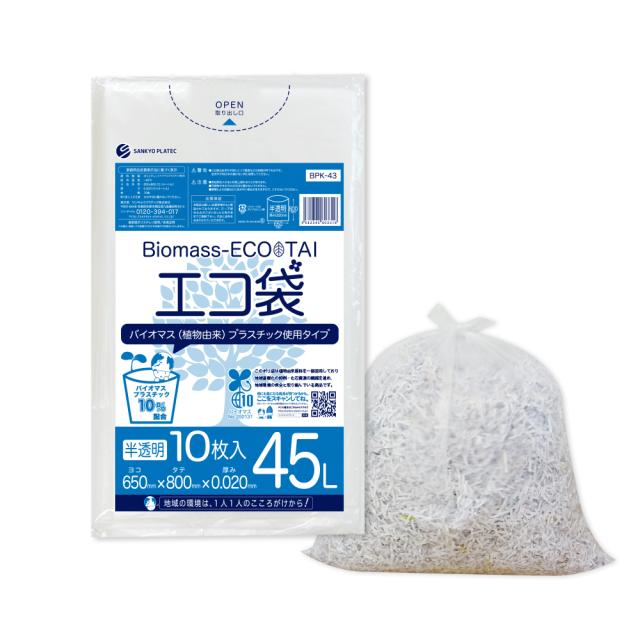 【バラ販売】BPK-43bara バイオマスプラスチック使用エコ袋 45リットル 0.020mm厚 半透明 10枚 / ゴミ袋 ごみ袋