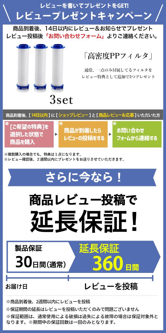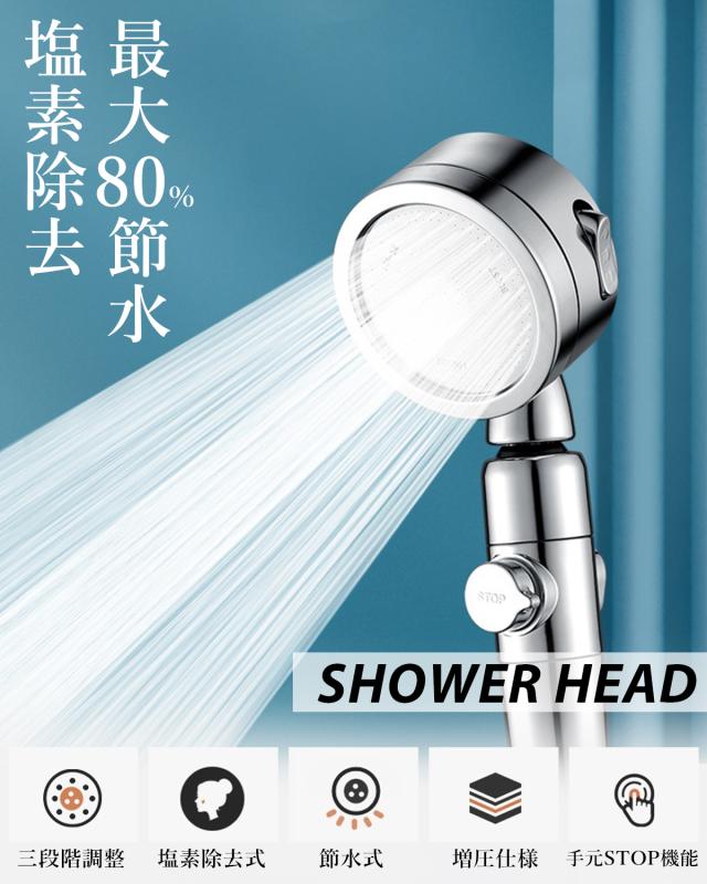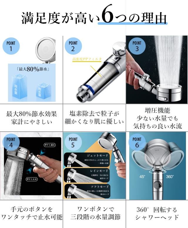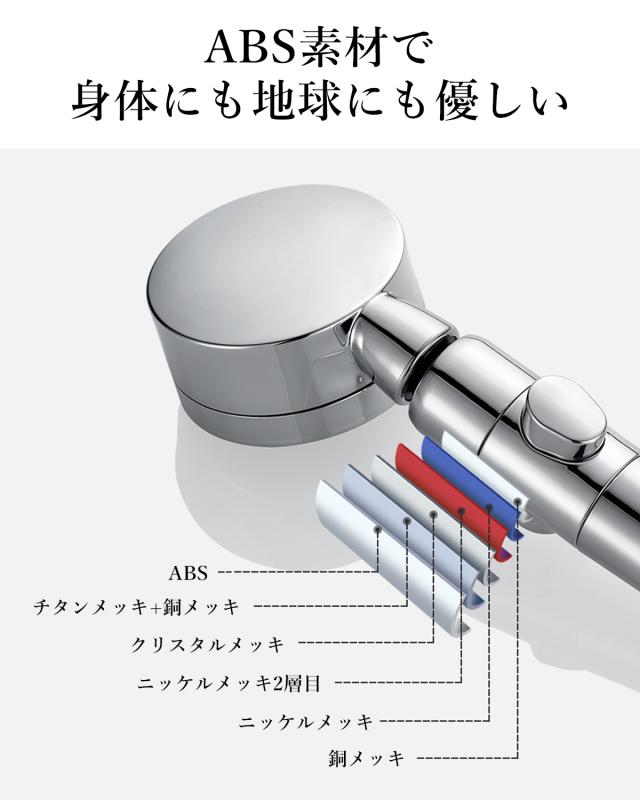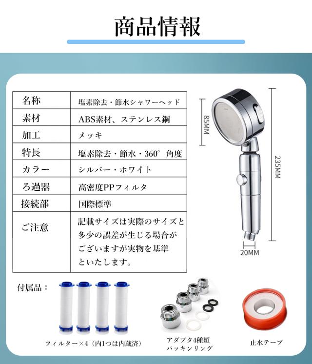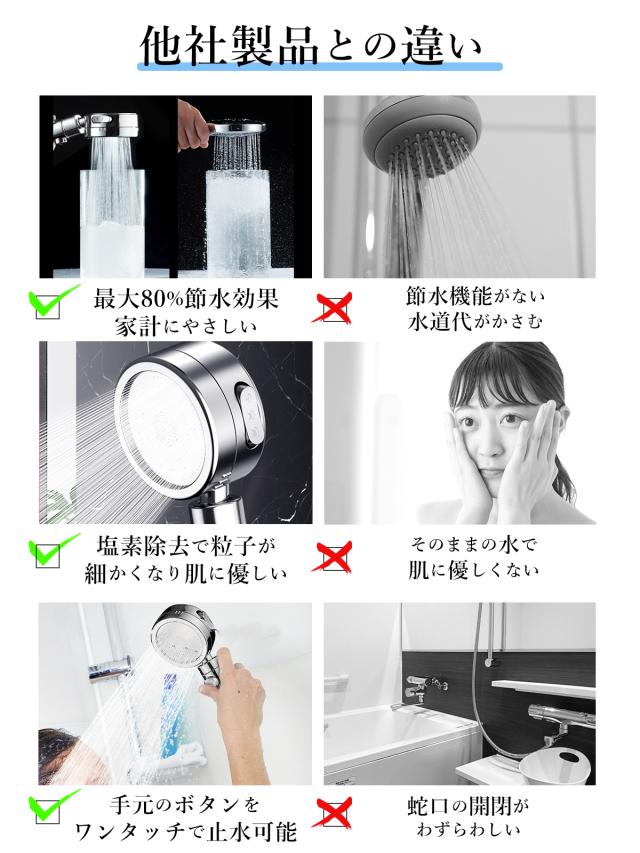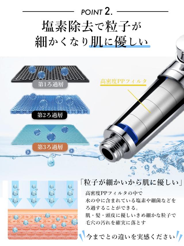 ・塩素除去で粒子が細かくなり肌に優しい。高密度PPフィルタの中で水の中に含まれている塩素や細菌などをろ過することができる。肌・髪・頭皮に優しいきめ細かな粒子で毛穴の汚れを確実に落とす。