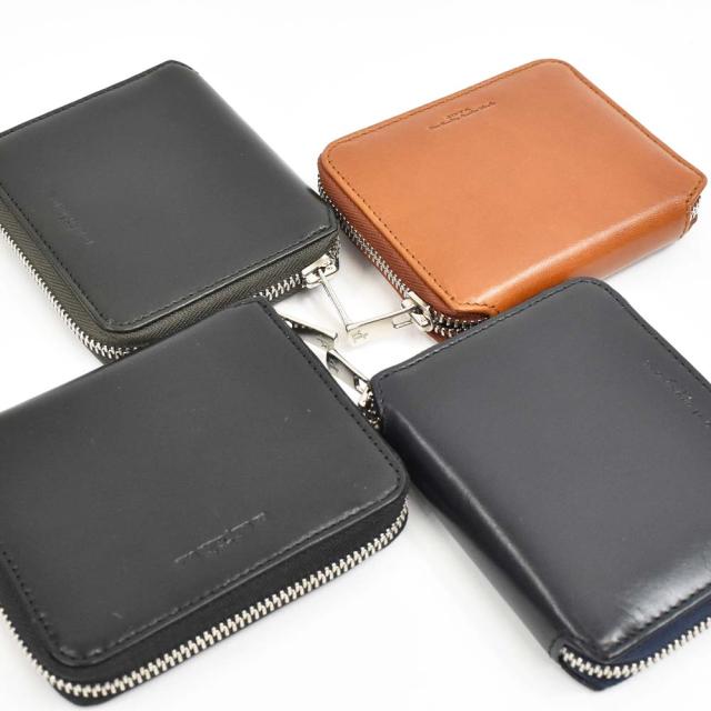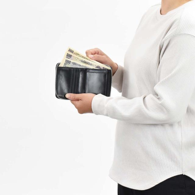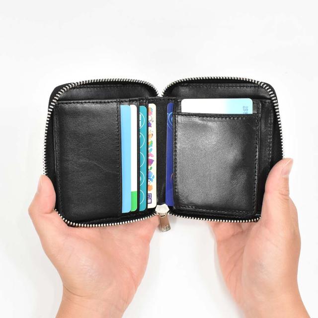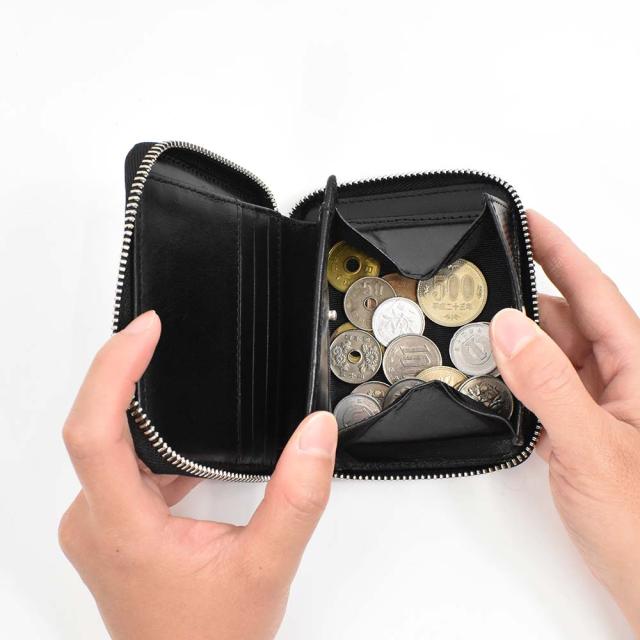 意外と少ないラウンドファスナー式の二つ折り財布。通常のラウンドファスナー長財布に比べてコンパクトな作りですが、4つのカードポケットと、2つのオープンポケットがあり、必要最低限のカードを収納できます。パンツのポケットにも納まる手のひらサイズのファスナー財布です。
