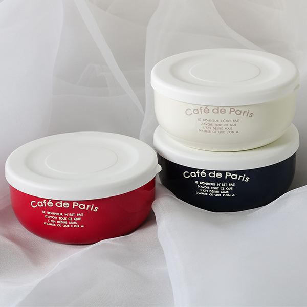 小鉢のようなデザインのサイドケースです。カラーはネイビー、レッド、アイボリーの3色展開で、シンプルな背景に英字のロゴがプリントされています。お弁当箱には見えないおしゃれなデザインなので、まるでカフェのようなランチ気分が楽しめます。