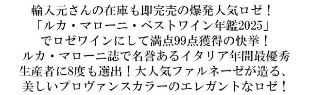 輸入元さんの在庫も即完売の爆発人気ロゼ! 「ルカ・マローニ・ベストワイン年鑑2025」 でロゼワインにして満点99点獲得の快挙!ルカ・マローニ誌で名誉あるイタリア年間最優秀生産者に8度も選出!大人気ファルネーゼが造る、美しいプロヴァンスカラーのエレガントなロゼ!■さまざまなギフトアイテムをご用意しております。お中元 ギフト 御中元 お盆 お礼 敬老の日 クリスマス 冬ギフト お歳暮 御歳暮 お年賀 御年賀 お正月 年末年始 ご挨拶 バレンタイン ホワイトデー お返し 父の日 母の日 ギフト 贈答品 お土産 手土産 御祝 御礼 内祝い 引き出物 お祝い 結婚祝い 結婚内祝い 出産祝い 出産内祝い 引き菓子 快気祝い 快気内祝い 進学祝い 誕生日祝い バースデーケーキ プレゼント Wedding ウェディング ホームパーティ お花見 パーティ 退職ギフト 退職 就任祝い0219002004866