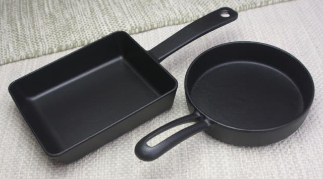 内径が約130mm×160mmの四角いフライパンと内径が約140mmの丸いフライパンです。