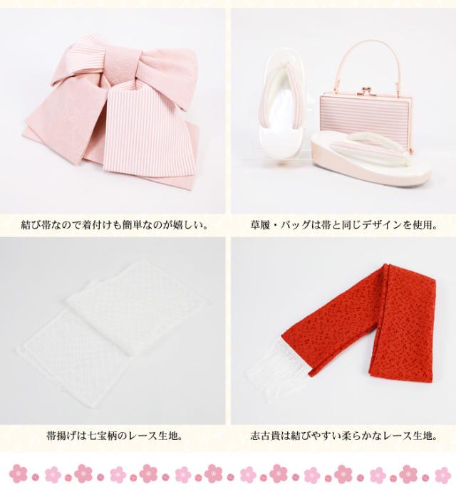 | 四つ身着物・長襦袢・重ね衿・結び帯・バッグ・草履(約21cm)・帯締め・帯揚げ・志古貴・筥迫・扇子・びら簪・腰紐3本・足袋 | |||